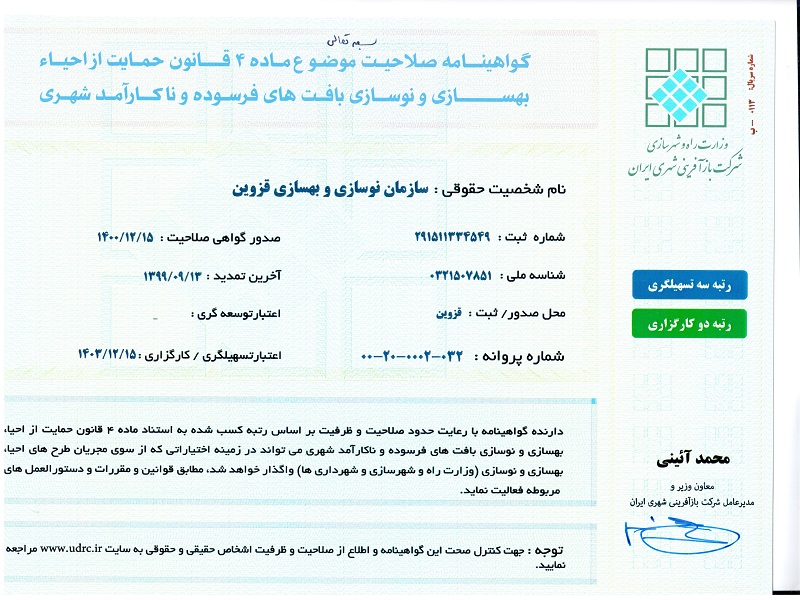 ضمن تمدید گواهی صلاحیت ماده۴ قانون حمایت از احیای بافت فرسوده شهری؛